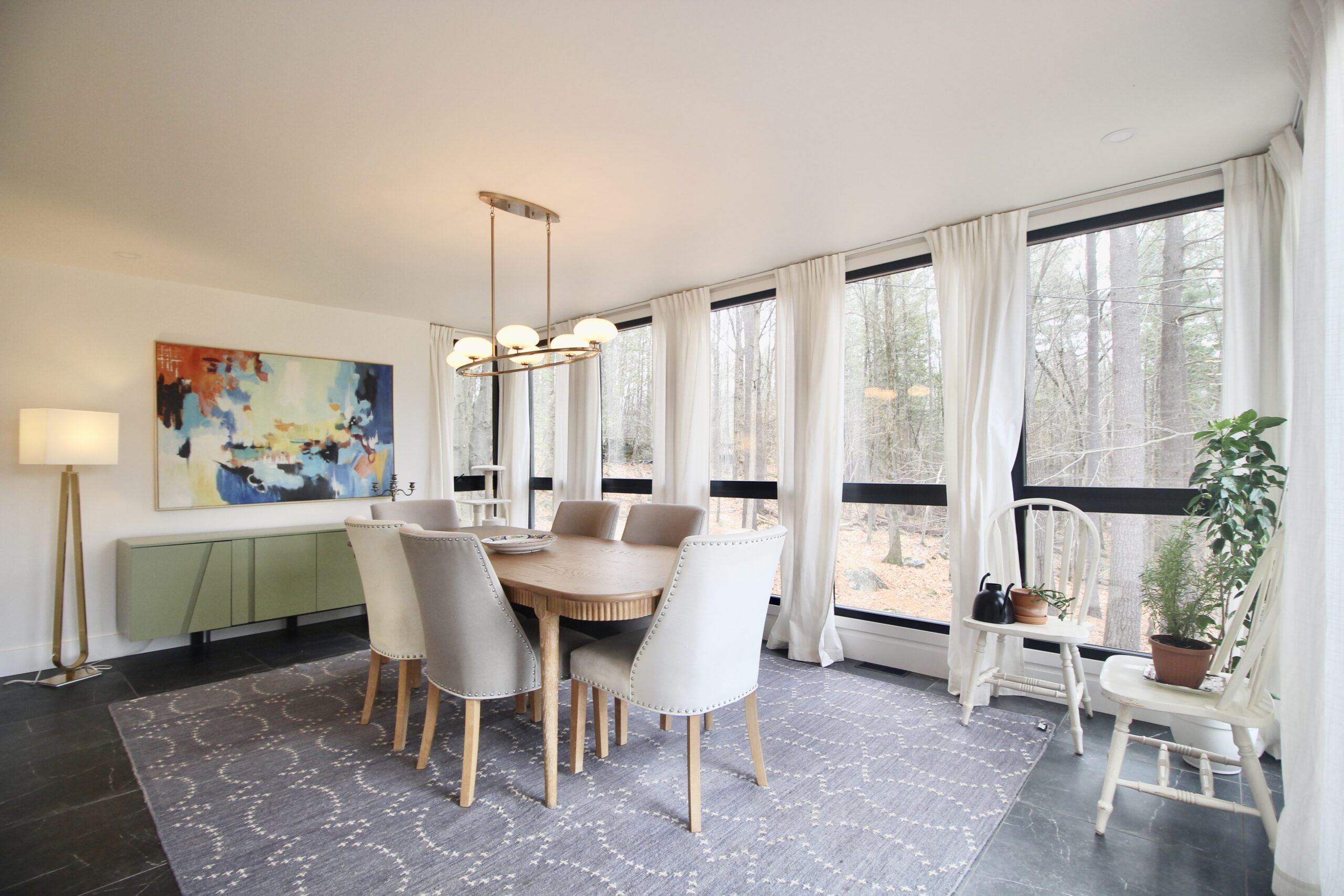 Our clients were looking to overhaul this architecturally designed 1950s home with the objectives of brightening it while making it cozy and comfortable. While keeping the architectural proportions, we wanted to dramatically improve the energy efficiency and update the home for a busy, modern family. We achieved this by stripping back most of the interior, adding spray foam insulation, exposing wood beams, and refinishing hardwood floors. We added heated floors in the kitchen, dining room and bathrooms. We updated all of the electrical and plumbing. We added an in-home gym area, moved glass doors and windows to places where they fit better, and replaced floor to ceiling windows. We removed a poorly installed addition, and created a large wrap around deck off the front and side of the home. We installed CanExcel siding and painted the old blue bricks a bright and clean white. We even tackled the separate garage, fencing and landscaping! We really transformed this home over the course of 2022, and the clients are thrilled with the result.